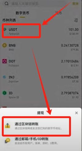 选择要提钱的币种是USDT。这时候会弹出来两种提钱方式,我们选择【通过区块链转账】。