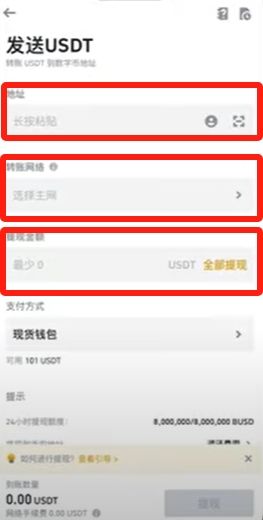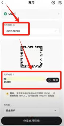 接下来的页面展示了充提币操作的三个要素,分别是地址、转账网络和提钱金额。
