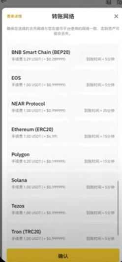 “提钱金额”很好理解。而在这三个要素中,充提币最先要确定的就是转账网络。因为要完成一次丝滑的转账,从平台A转到平台B,两边的网络一定要匹配,所以我们先点击转账网络,看看币安都支持什么网络。