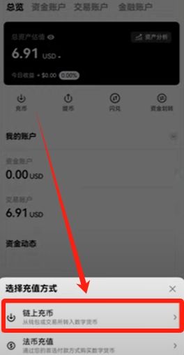 充值方式选择【链上充币】。从钱袋或交易所转入数字货币。