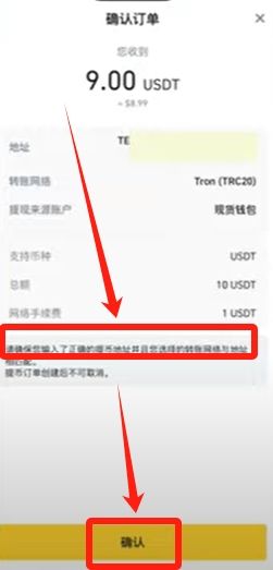 再次确认订单。它这里反复提醒“转账网络要匹配”,确实是很多新手容易失误的地方,点击【确认】。
