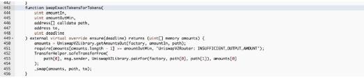链上所有的应用程序(dApp)也都是由智能合约驱动的,不论是借款协议、去中心化交易所(DEX)、预言机或NFT 市场。这些协议都是由一个或多个智能合约组成的,而合约里面都会写好各式功能,让协议能正常被用户使用。例如我们刚刚举例的“Swap Exact Tokens for Tokens” 功能,就能在下图合约上看到当用户地址呼叫这个功能时,合约会做什么相对应的操作。