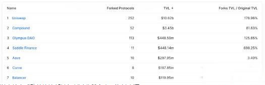 以太坊上成功的协议都被复制过非常多次。资料来源:DeFiLlama