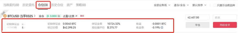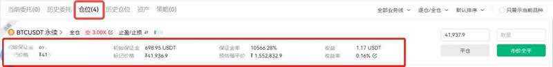 4.挂单成交后,可在持仓界面中可查看订单的相关数据,例如保证金、收益、收益率、预估强平价等。