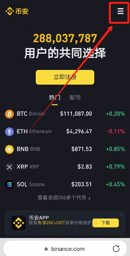 这样我们就来到了币安的官网,点击右上角的三条横杠。