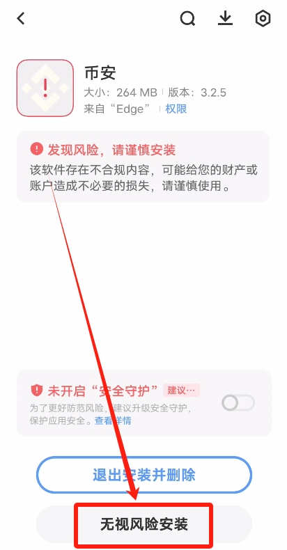 这个时候它给我们跳出有风险,我们无视它就可以了。因为这个币安软件不是来源于我们自带的手机的应用商店,我们只需要知道这个币安的软件,是我们在它的官网下载的正版的APP就可以了。点击“无视风险安装”。