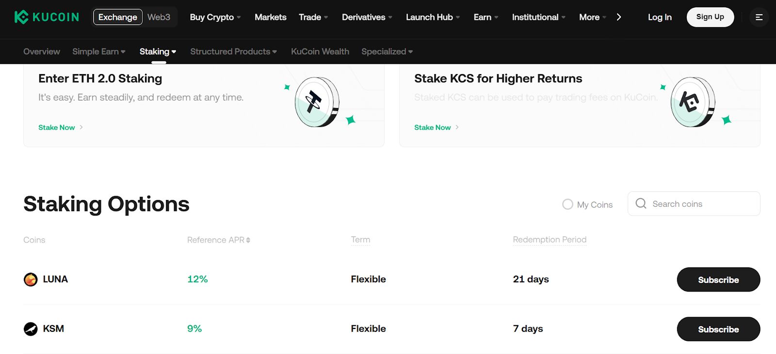 KuCoin 提供灵活质押和锁定质押两种选择。锁定质押可获得更高奖励,而灵活质押则确保流动性。该平台还支持对一些新兴或不太常见的加密货币进行质押,让您有机会参与独特的投资项目。