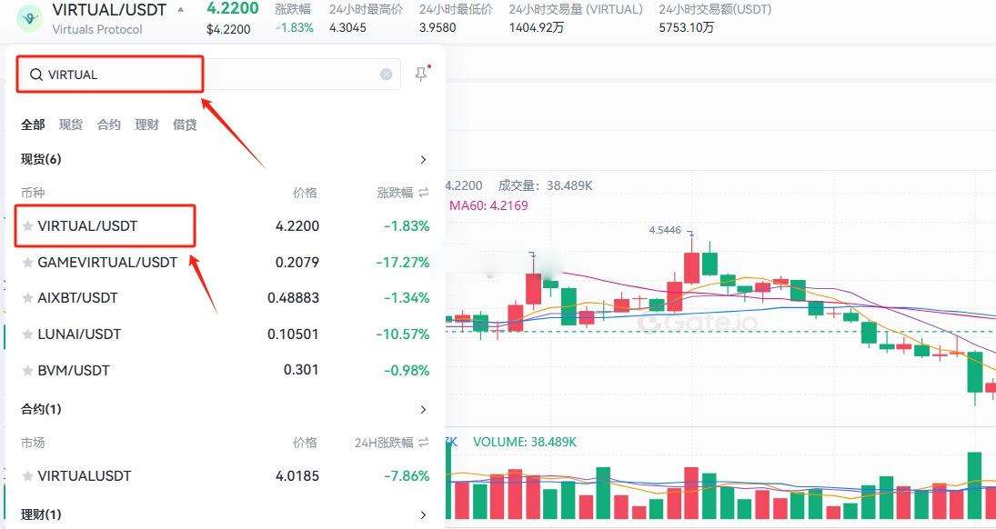 6、在进入也页面后,搜索VIRTUAL,选择VIRTUAL/USDT,就可以看到该币种的交易信息以及市场信息