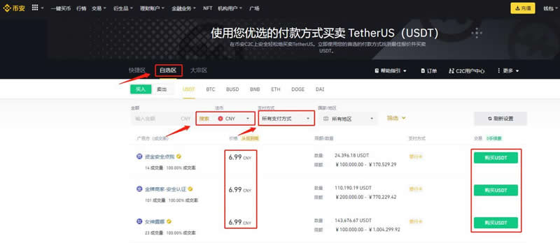 7、选择【自选区】,注意币种为USDT,法定货币选择【】,根据需求选择合适广告方,点击【购买USDT】(支付方式可筛选指定交易方式的商家)