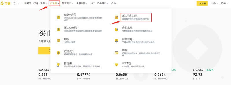9、在币安首页,点击“衍生品”- “币安合约概览”。或者,您可以直接前往合约交易介面。