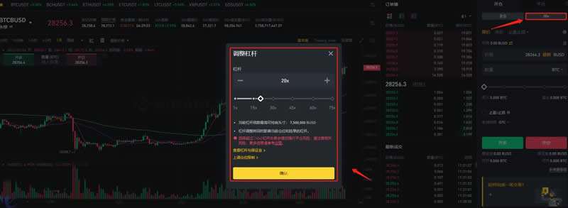 20、然后,您需要【调整杠杆】并点击【确认】。请注意:高杠杆意味着高风险,如果没有稳健的风险管理策略,不建议使用高杠杆。