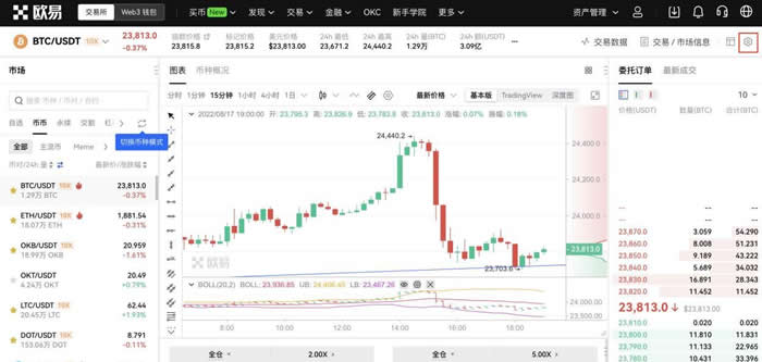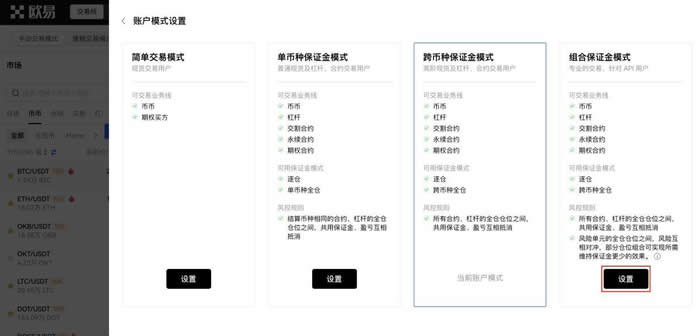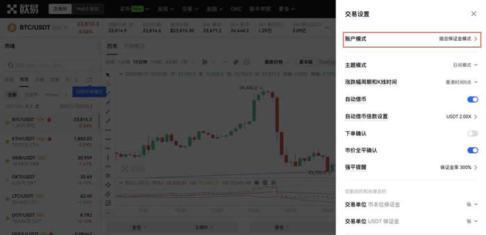 1、打开欧易官网注册后登录,进入交易页面,点击右上角设置图标,选择【账户模式】-【组合保证金模式】;