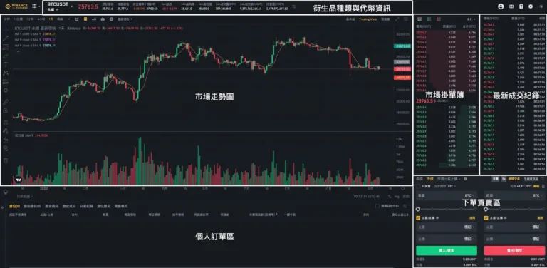 衍生品种类与代币资讯:包含代币选择、衍生品种类、标记价格、指数价格以及资金费率等等。市场走势图:币价走势,可以切换时间的时间长短,另外加密货币世界中通常以绿色代表上涨,红色代表下跌订单历史纪录:已执行的订单纪录。市场挂单簿:目前市场上的买卖单,也代表了市场的流动深度。最新成交纪录:已完成的市场交易纪录。下单买卖区:实际开单交易区块。个人订单区:当你在完成下单后,你所下的单会出现在这。