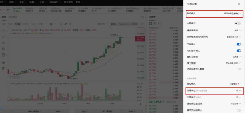 4、点击交易页面右上角设置图标-【交易设置】-选择【账户模式】【交易单位】等选项进行设置。