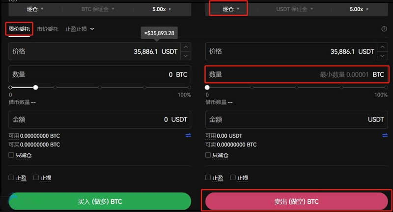 7、选择【全仓/逐仓】、【USDT保证金】、【杠杆倍数】、【限价委托】-输入【价格】、【数量】或者【金额】-点击【卖出(做空)BTC】-【确认】。