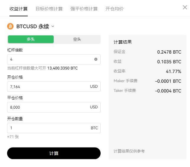 目前很多交易所都是可以直接在线计算比特币合约100倍杠杆收益的,下面是欧易交易所的杠杆收益计算方法: