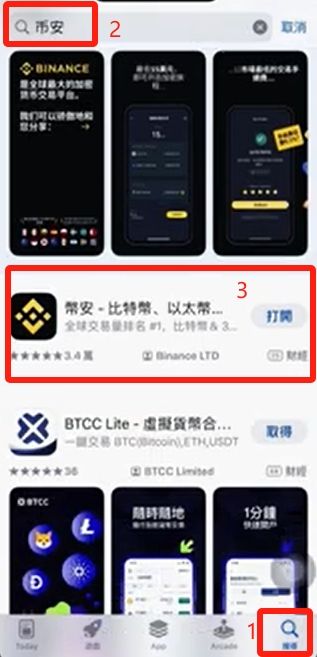 如果你和我一样用的是海外ID,那么软件内的文本会变成繁体字,可能有一点观看困难,所以请仔细的观看。我们点击右下角的放大镜图标,在上方输入“币安”进行搜索,第一个显示的是广告,我们选择下面的这个繁体字的币安选项,点击后面的下载安装,稍等一下就安装好了。