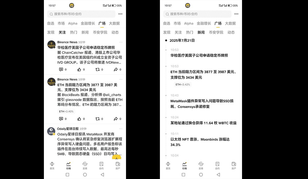 专业资讯流:实时推送币安官方公告、行业重大新闻、项目最新进展、市场行情异动,信息源经过严格筛选。