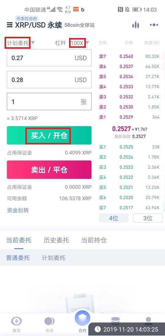 例如:我计划以0.28美元买入XRP/USD合约,则在开仓方式里选择“计划委托”,触发价格设定为0.27美元(当市场价格触及0.27美元时,会触发我的委托,但不会成交),执行价格输入0.28美元,点击买入/开仓。