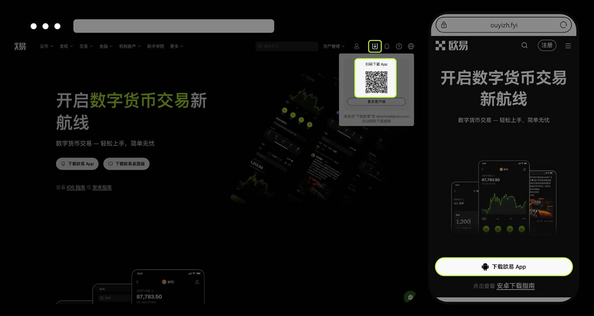 打开欧易官网(),点击下载图标,用手机扫描出现的二维码。建议用浏览器进行扫码,微信扫码可能会出现网页停止访问的情况;