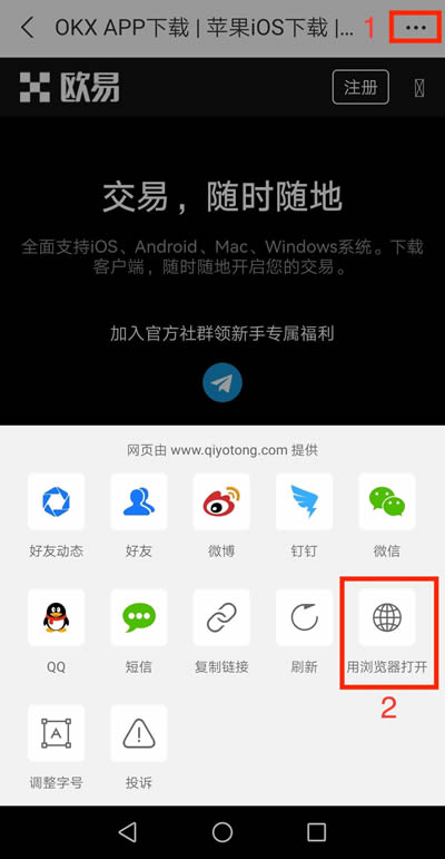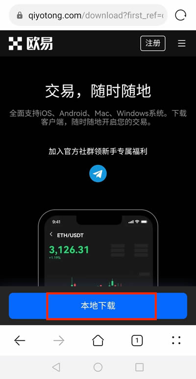 安卓手机下载:打开欧易官网,点击下载图标,用手机扫描出现的二维码(建议用浏览器进行扫码,微信扫码可能会出现网页停止访问的情况),点击【本地下载】,然后根据提示完成下载、安装。