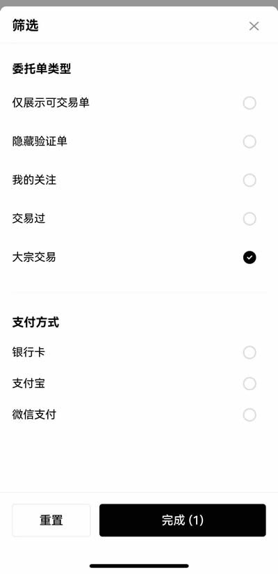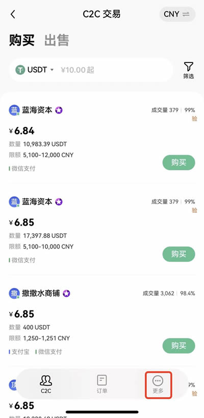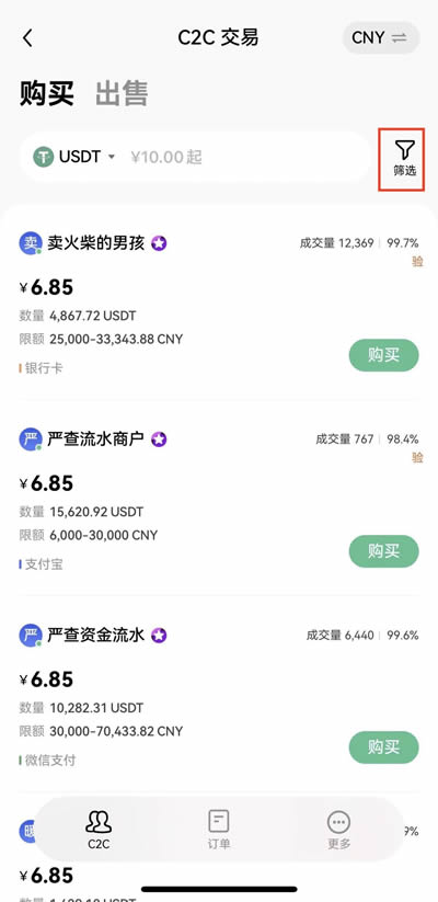 除【快捷买币】区进行买币之外,您也可以选择【C2C买币】区进行交易,选择您认为合适的订单。如果交易金额≥10万元,也可在【更多筛选】里选择【大宗交易】。