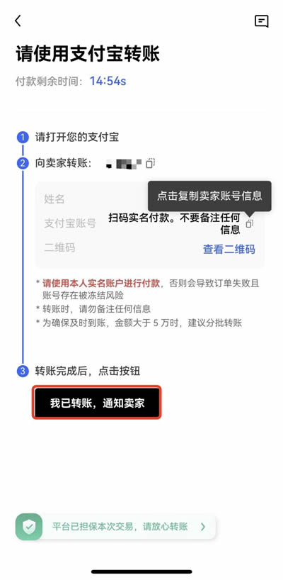 点击【确认出售】,等待买家付款,待确认收款点亮后即表示对方已付款,请及时查看钱款到账情况,请务必登录手机银航或网银查看到账情况,确认钱款到账后尽快点击【确认收款】将数字资产发放给买家即可。