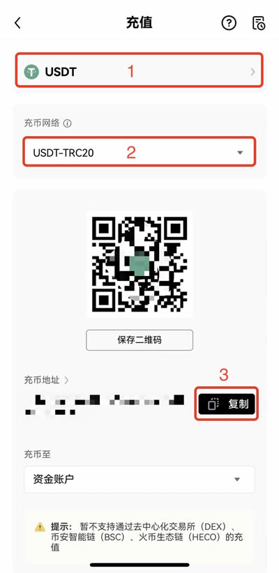 注:选择充值网络时,其他交易所或钱袋【提币/提钱网络】要与欧易充值的网络保持一致,例如都为USDT-TRC20,否则币会丢失。