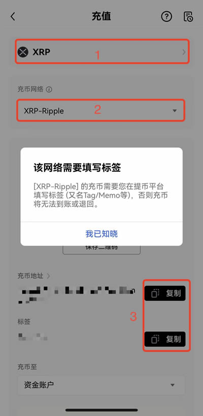 某些币种需要填写标签,例如XRP,在充值地址的上方会标注需要填写的标签,通常是一串数字,充值这些币种时必须需要填写充值地址和标签,否则币会丢失。