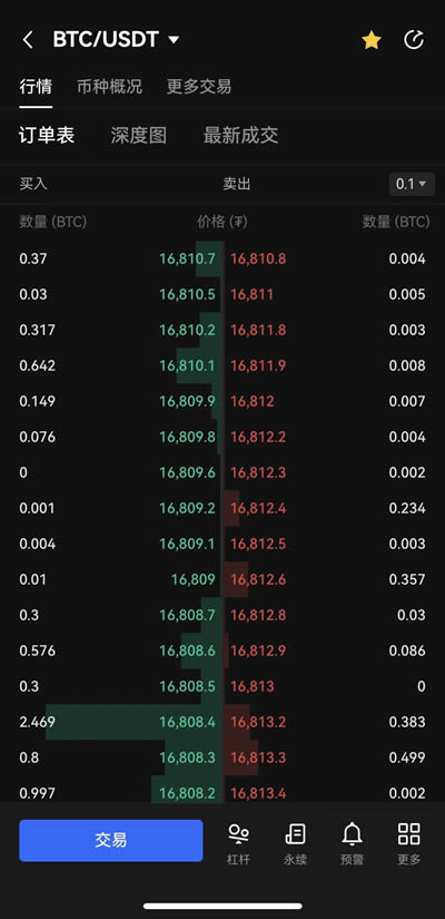 币对挂单信息查看:【买入/卖出】页面右边是交易深度页面,可以在页面中看到买入和卖出的挂单情况,上方红色区域是卖盘,下方绿色区域是买盘。