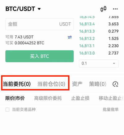 委托单查看:【买入/卖出】页面下方,可以查看【当前委托/当前仓位】等信息。