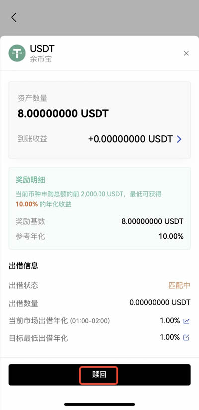 赎回,以余币宝为例:申购成功的经济业务产品,会显示在【经济账户】栏下方,点击相应产品-【订单管理】-【赎回】-输入【金额】-点击【确认】完成操作。完成赎回之后,本金和收益会发放至您的【资金账户】,请注意查看。