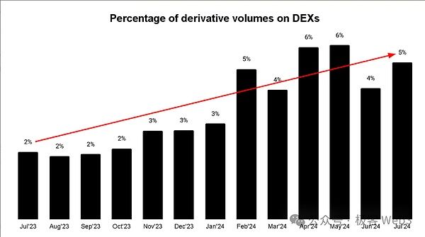 多项研究表明,随着永续合约交易规模的增长,在现货市场不活跃时,永续合约市场已经开始具备价格发现的功能。DEX上的永续合约交易量,也从2021年7月的10亿美元,增长到了2024 年7月的1200亿美元,年复合增长率约为393%。