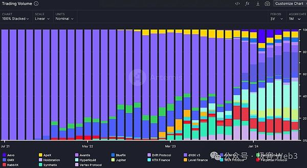 自从BitMEX交易所于2016年首次引入永续合约以来,永续合约DEX开始迅速发展,如今市场上支持永续合约的DEX已超过100家。早期永续合约DEX规模很小,2017年时,dYdX在以太坊生态上线,并在相当长的时间内主导了永续合约市场,因此去中心化的永续合约交易也主要集中在以太坊上,且当时合约交易量很低。而如今,我们在各个链上都能看到活跃的永续合约DEX,合约交易已成为加密生态系统不可或缺的一部分。