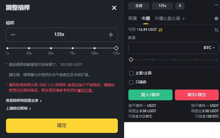 以币安合约为例,杠杆倍数可以开1~100 倍。如果用100 美元开10 倍杠杆做多比特币,等于下单了价值1,000 美金的合约做多部位。