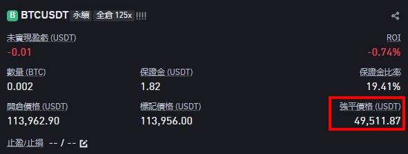 也就是说,你的初始保证金(100 USDT)已经被完全亏损,系统就会强制平仓,也就是我们常说的「爆仓」。