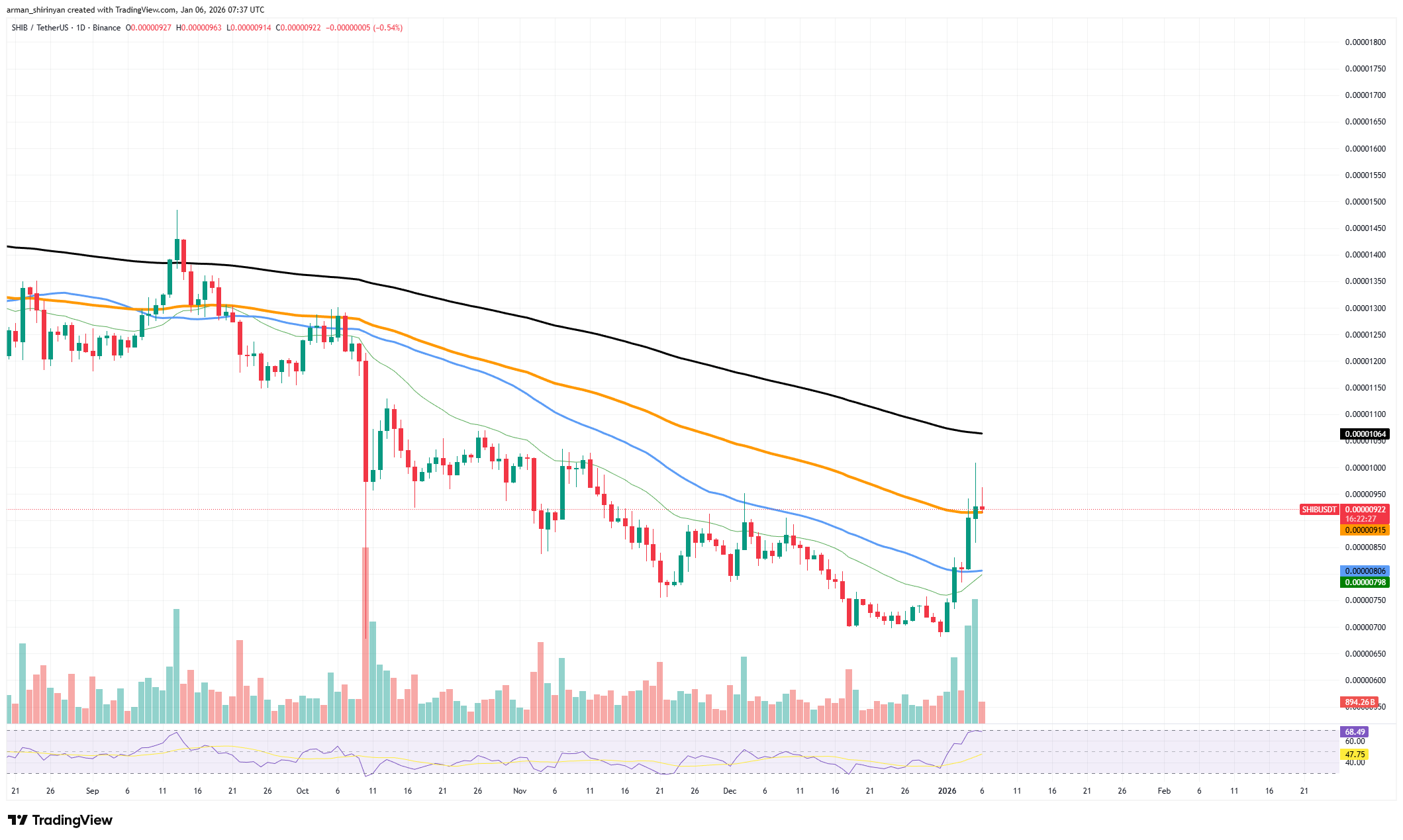 买盘压力的突然激增推动SHIB突破100日指数移动平均线(EMA),进而引发这轮上涨。该均线数周来始终构成强劲的动态阻力,既压制上行尝试又强化整体下跌趋势。