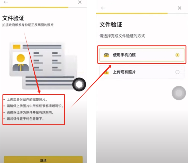 点击币安首页的【去认证】,选择你所在的国家或者是地区,身份件件可以选择身份件或者是护照。推荐大家使用身份件。选择【身份件】,点击【继续】