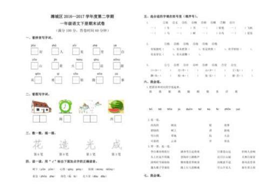 小学一年级语文下册期末测试题及答案考试时间120分钟考试总分100分题号1四五总分分数-时间60分钟满分100分超序―四五六七A九++总分得分一基础积累(76分) 一、我会在正确的音节或汉……