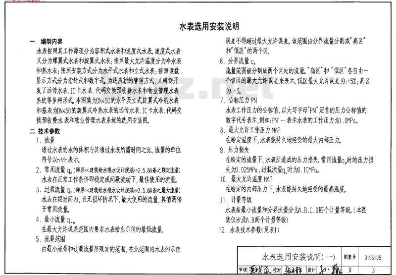 误差不得超过最大允许误差。该范围由分界流量分割成”高区水表按照其工作原理分为容积式水表和速度式水表。速度式水表又分为螺翼式水表和旋翼式水表;按照最大允许温度分为冷水表和热水表:按照安装方式分为水平式水表和立式水表:按照读数显示方式分为指针式和数字式,为适应新的管理方式,又研制开发了远传水表,IC卡水表,代码交换预收费水表和物业管理水表系统等多种形式,本图集为DN≤50的水平及立式旋翼式冷热水表和基表为DN<50的旋翼式冷热水表的远传水表,IC卡水表,代码交换预收费水表和物业管理水表系统的选用安装图二.技术参数