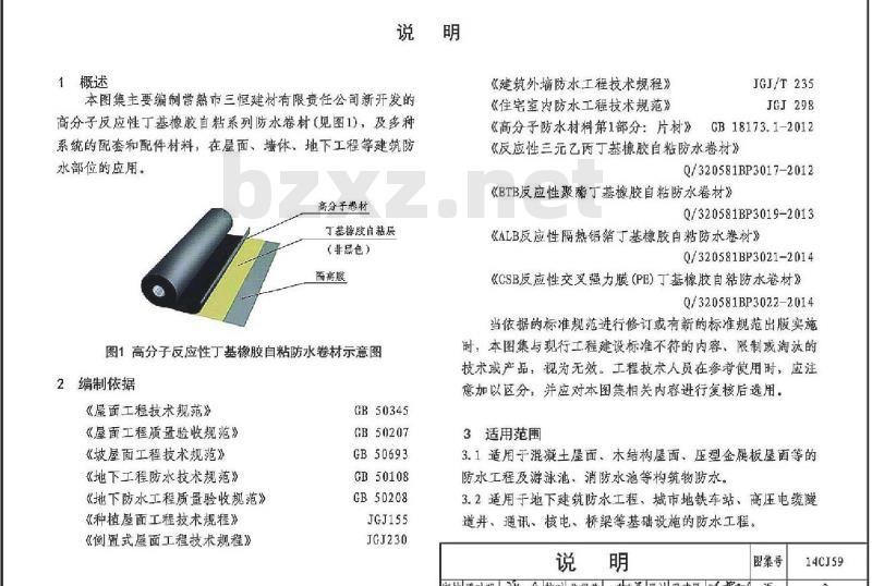 14CJ59《丁基自粘防水材料建筑构造》国家建筑标准设计参考图集是以常熟市三恒建材有限责任公司的8种防水产品在建筑屋面、地下室、外露管道等防水工程中的应用技术为依据编制的。适用于全国各地区的民用建筑及工业建筑。 图集内容主要包括:说明、材料简介及技术指标、材料选用表、各使用部位构造做法及相关构造节点详图。图集条理清楚、选用方便、能满足设计和施工的需要。 该图集适用于平屋面、坡屋面、单层屋面、地下室的防水工程,也适用于混凝土屋面、金属屋面的防水翻修工程。