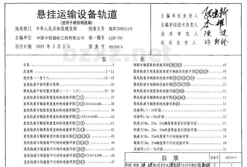 1.1本图集为悬挂运输设备轨道(以下简称轨道)与钢屋架连接的施工图,图集编号为05G359-4。1.2本图集适用于悬挂在钢屋架上的一台机构工作级别为M1~MS与手动葫芦配套使用的手动单轨小车、电动葫芦(以下统称为电动葫芦)或一台起童机工作级别为A1~A5的手动梁式悬持起重机,电动单梁悬挂起重机(以下统称为电动单梁悬挂起重机)。1.3本图集直线轨道适用于额定起重量≤3.2t的电动葫芦或电动单梁悬挂起重机,轨道计算跨度为6.0m、7.5m、9.0m三种,1.4本图集弧线轨道适用于额定起重量≤3.2t的电动芦,轨道支承点夹角为90°60°、45°、30°四种;轨道曲率半径为1.25m.1.50m、2.00m2.50m、3.00m.3.50ml、4.00m、4.50m八种。