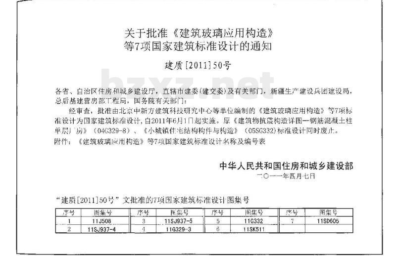 各省,白治区伴房和城乡建设厅,古辖市律委(建交委)及有关部门,新疆生产建设兵团建设局总后基建营房部「程局,国务院有关部门经审查,批准由北京中新方建筑科技研究中心等单位编制的《建筑玻璃应用构造》等7项标准设计为国家建筑标准设计,白2011年6月1口实施。原《律筑物抗震构造详图一钢筋混凝土柱单层)房》(04G329-8)、《小城镇住宅结构构件与构造》(05SG332)标准设计同时废止。附件:《建筑玻璃应用构造》等7项国家建筑标准设计名称及编号表中华人民共和国住房和城乡建设部一〇一一年四月七月