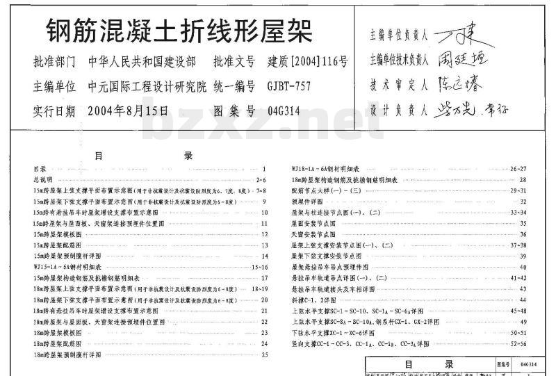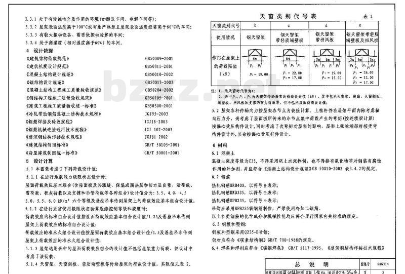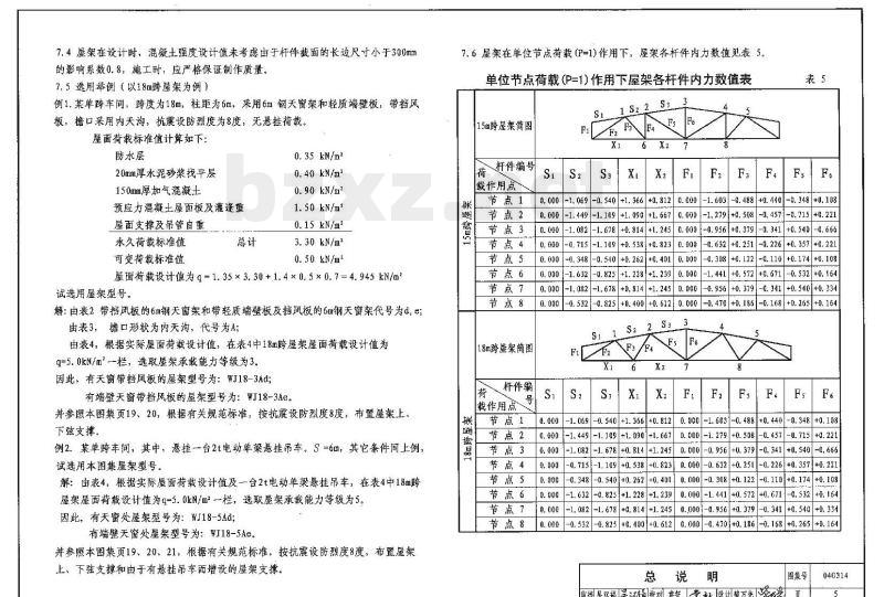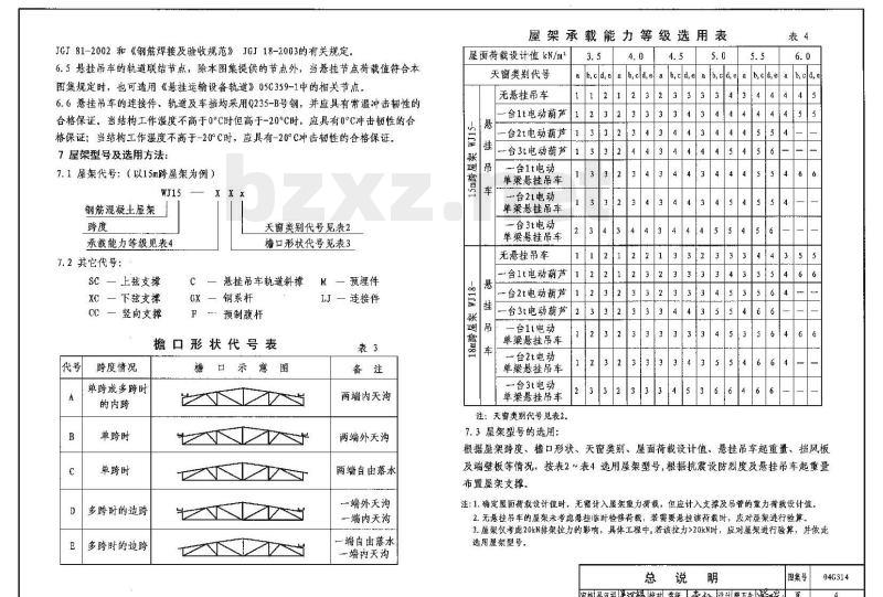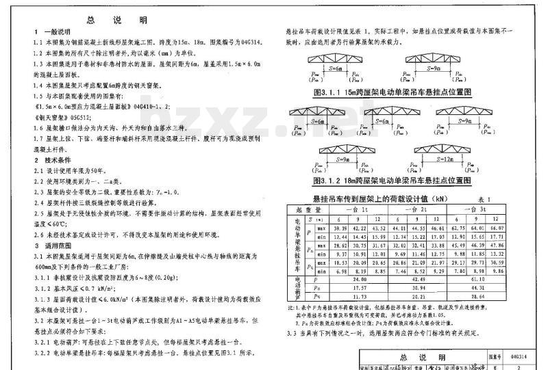 1.1本图集为钢筋混凝土折线形屋架施工图。跨度为15m、18m。图集编号为04G314.1.2本图集的所有尺寸除注明者外,均以毫米(mm)为单位。1.3本图集适用于卷材和非卷材防水的屋面。屋架间距为6ml,屋盖采用1.5m×6.0m的混凝土屋面板。