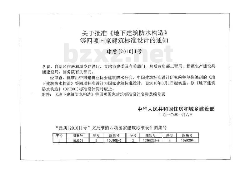 关于批准《地下建筑防水构造》等四项国家建筑标准设计的通知建质【2010]1号wwW.bzxz.Net