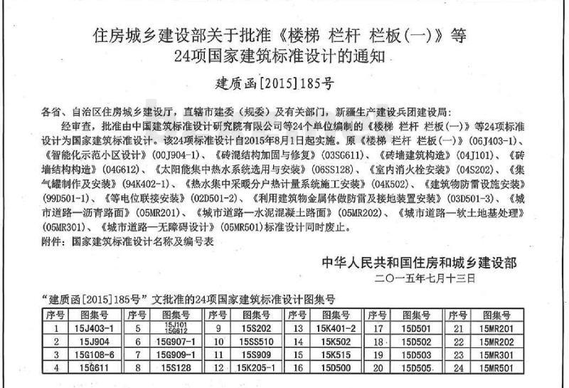 “建质函[2015]185号”文批准的24项国家建筑标准设计图集号序号