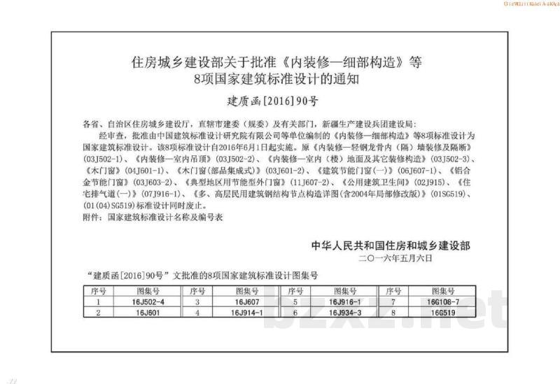 各省、自治区住房城乡建设厅,直辖市建委(规委)及有关部门,新疆生产建设兵团建设局:经审查,批准由中国建筑标准设计研究院有限公司等单位编制的《内装修一细部构造》等8项标准设计为国家建筑标准设计。该8项标准设计自2016年6月1日起实施。原《内装修一轻钢龙骨内(隔)墙装修及隔断》(03J502-1)、《内装修一室内吊顶》(03J502-2)、《内装修一室内(楼)地面及其它装修构造》(03J502-3)《木门窗》(04J601-1)、《木门窗(部品集成式)》(03J601-2)、《建筑节能门窗(一)》(06J607-1)、《铝合金节能门窗》(03J603-2)、《典型地区用节能型外门窗》(11J607-2)、《公用建筑卫生间》(02J915)《住宅排气道(一)》(07J916-1)、《多、高层民用建筑钢结构节点构造详图(含2004年局部修改版)》(01SG519)、(01(04)SG519)标准设计同时废止。附件:国家建筑标准设计名称及编号表中华人民共和国住房和城乡建设部二〇一六年五月六日