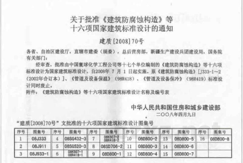 关于批准《建筑防腐蚀构造》等十六项国家建筑标准设计的通知建质[2008】70号