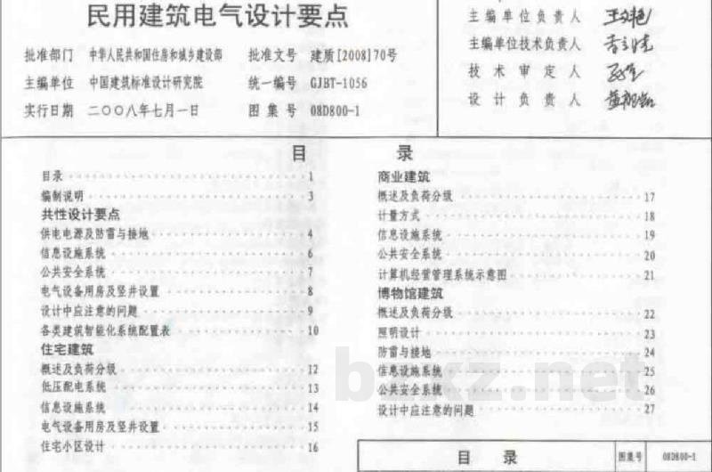 在多本强电现行国家建筑标准设计图集的基础上,根据《民用建筑电气设计规范》JGJ16-2008及新技术、新产品,进行全面的整合、提炼、补充,以民用建筑工程为主,编制常用的、量大面广的、施工方便的图集,内容全面、精炼、便于查找。包含以下图集08D800-1《民用建筑电气设计要点》:本图集涵盖了民用建筑中的住宅建筑、商业建筑、博物馆建筑、旅馆建筑、医院建筑、汽车库建筑、办公建筑、学校建筑、剧场建筑、图书馆建筑、体育建筑共11类常见建筑类型。根据各种类型建筑的特点,重点介绍各类建筑在设计过程中应掌握的要点。设计要点包括负荷分级、供电电源、低压配电系统、计量方式、照明、防雷与接地、智能化系统、电气设备用房及电气竖井设置、设计中应注意的问题等。08D800-2《民用建筑电气设计与施工-供电电源》:负荷分级及供电措施、供电系统设计、自备应急电源(应急柴油发电机组、EPS应急电源装置、UPS不间断电源装置)设计及负荷计算方式。08D800-3《民用建筑电气设计与施工-变配电所》:高压开关柜安装、油浸式变压器安装、干式变压器安装、预装式变电站安装、低压配电柜安装、继电保护要求、变配电所常用数据及变配电所示例。