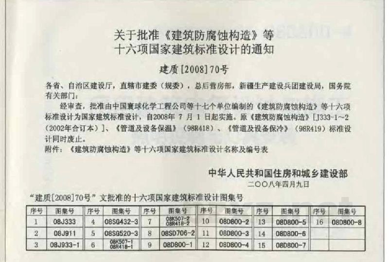 经审查,批准由中国意球化学工程公司等十七个单位编制的《建筑防腐蚀构造》等十六项标准设计为国家建筑标准设计,自2008年7月1日起实施。原《建筑防腐蚀构造》「J333-1~2(2002年合订本)、《管道及设备保温》(98R418)《管道及设备保冷》(98R419)标准设计同时废止